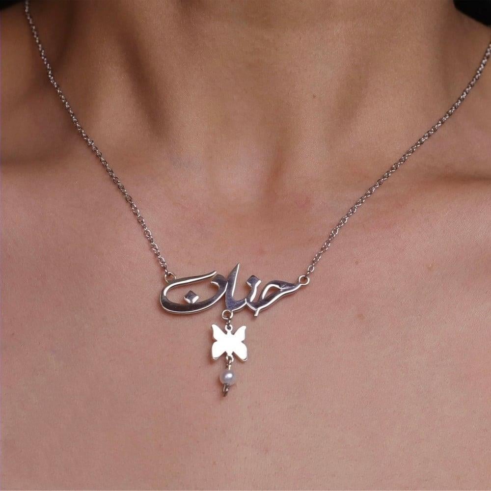 سلسال رقبة بتصميم الفراشة واللؤلؤتفاصيل المنتج:نصمم حسب الطلب.نكتب بجميع اللغة حسب الطلب.ضمان اللون.متوفر اللون ذهبي و فضي.مطلي بالذهب عيار 21