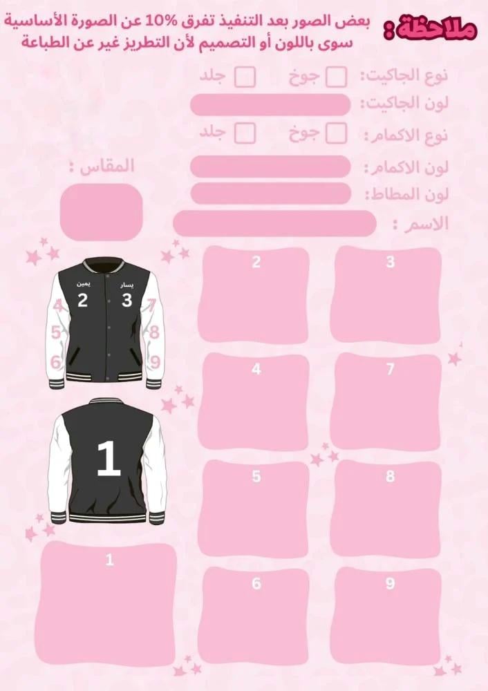 تنويه : يرجى كتابه نوع القماش الجلد او الجوخ بالإضافة الى لون الكم وشكل المطاط في الياقة والكم في نموذج